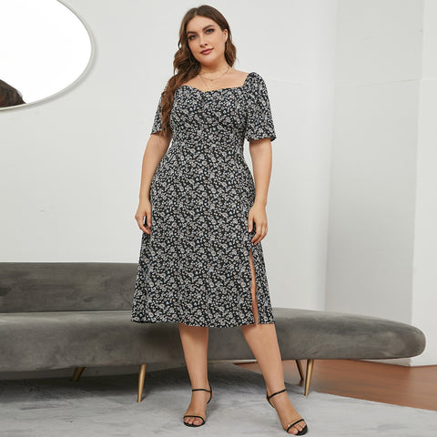 New Large Size Women French Square Neck Waist Open Long Floral Dresses Summer JR5031