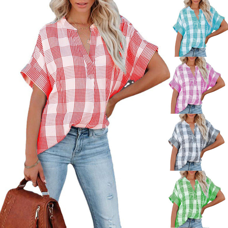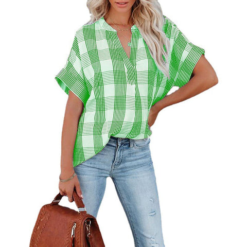 Spring And Summer New Plaid Short Sleeved Shirt Printing V Neck Loose Casual Top For Women