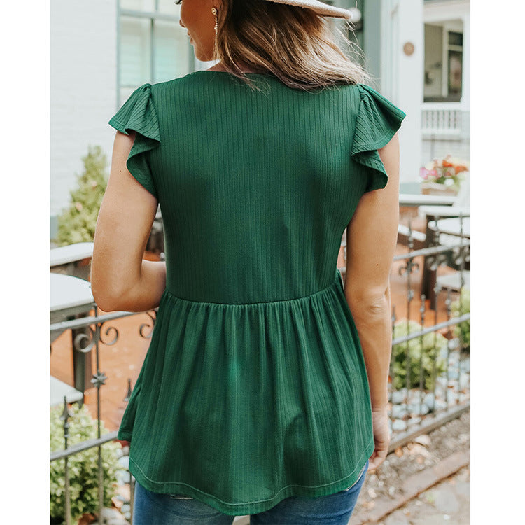 Spring Summer Ribbed Ruffle Sleeve V-Neck Babydoll Short Sleeve Design Casual Top