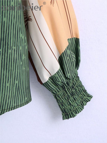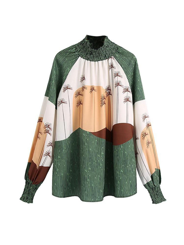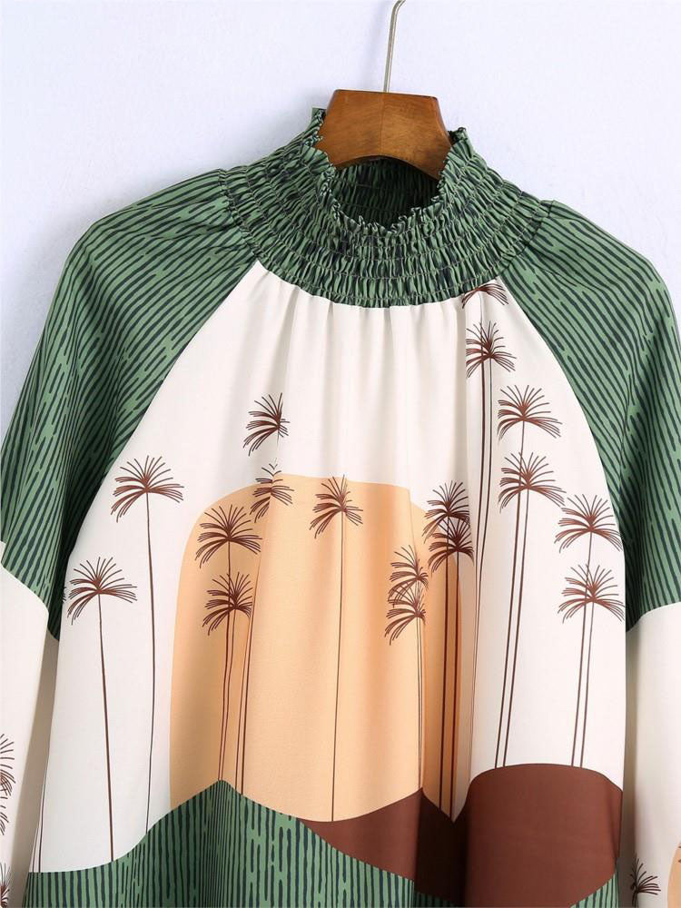 Summer Women Loose Shirt Traf Shirring Trim Scenery Print Raglan Sleeve Casual Blouses Female Chic Oversized Tops