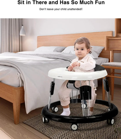 Stair Hazard: Securely block stairs before using the walker to prevent serious injury or death! Never leave children unattended! Use only on flat surfaces! Do not adjust the height of the walker while your child is in it! Never allow your child to push the walker! To avoid burns, keep your child away from hot liquids, stoves, radiators, heaters, fireplaces, etc.
