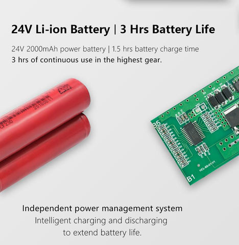 24V 2000mAh Power Li-ion Battery, 3 hrs of continuous use in the highest gear.