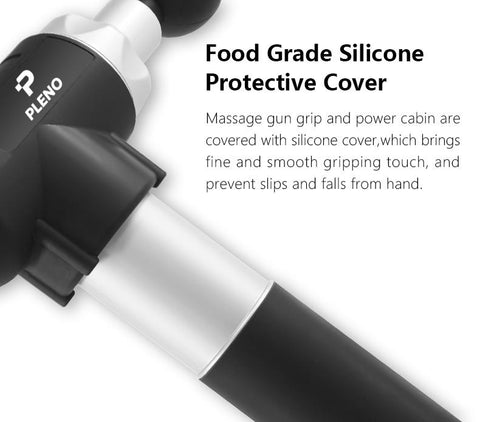 Massage gun grip and power cabin are covered with silicone cover, which brings delicate and smooth gripping touch, and prevents slips and falls from hand.